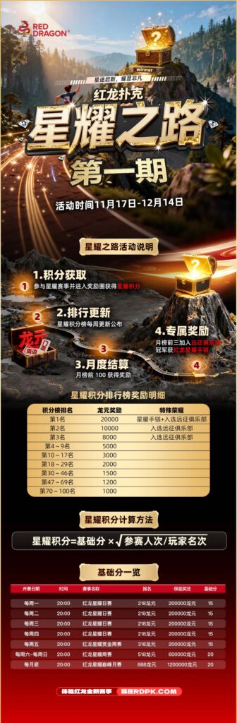 星耀之路是红龙全新推出的长周期积分赛制,参与任意星耀赛事并进入奖励圈,即可获得星耀积分。