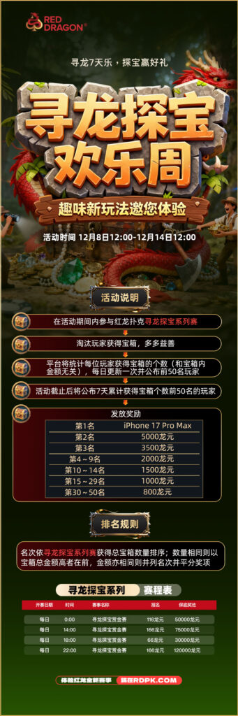在活动期间,参与《红龙扑克 – 寻龙探宝系列赛》,